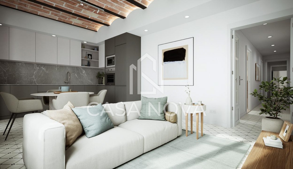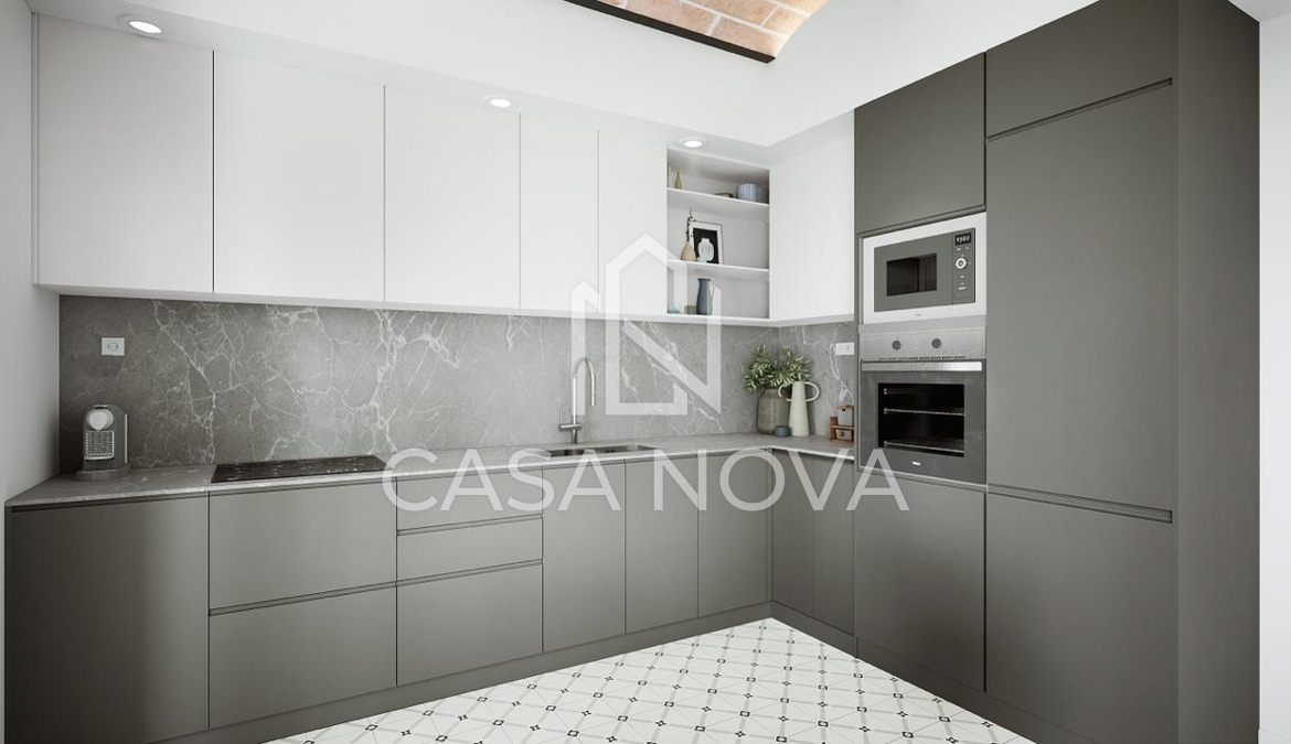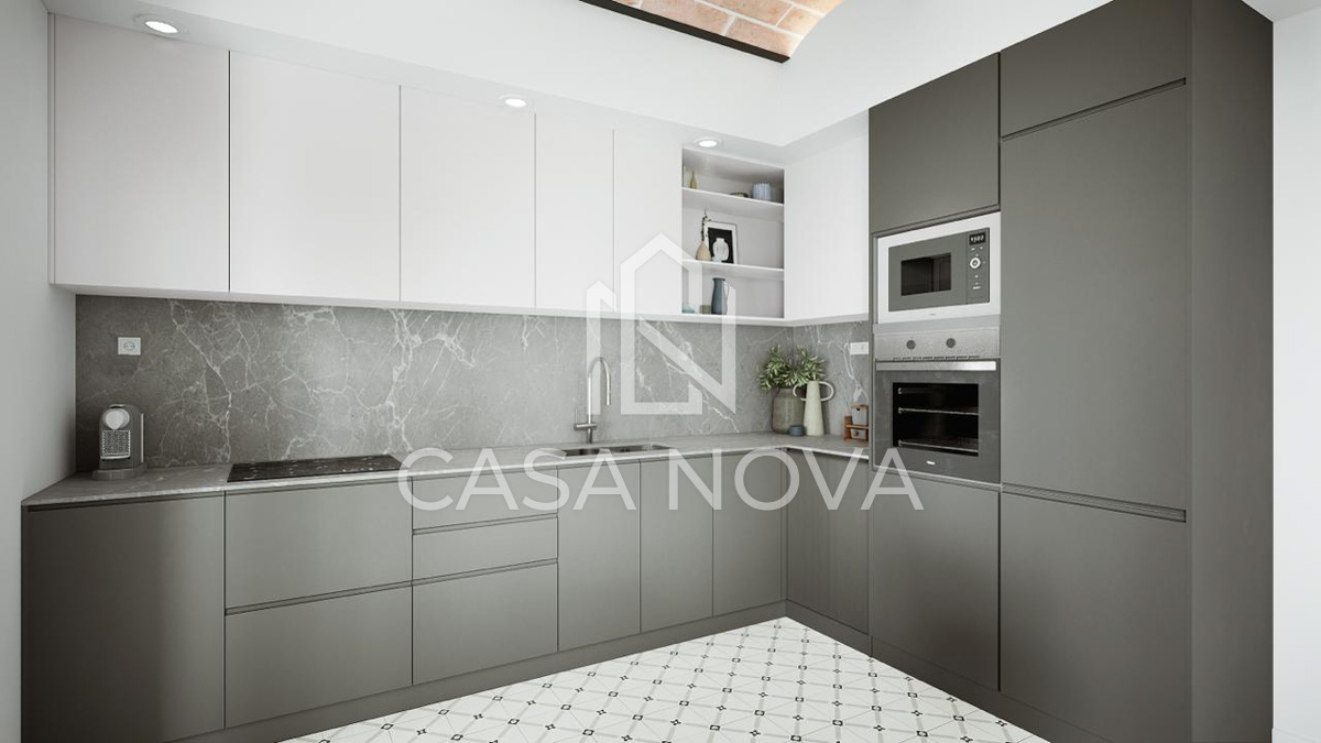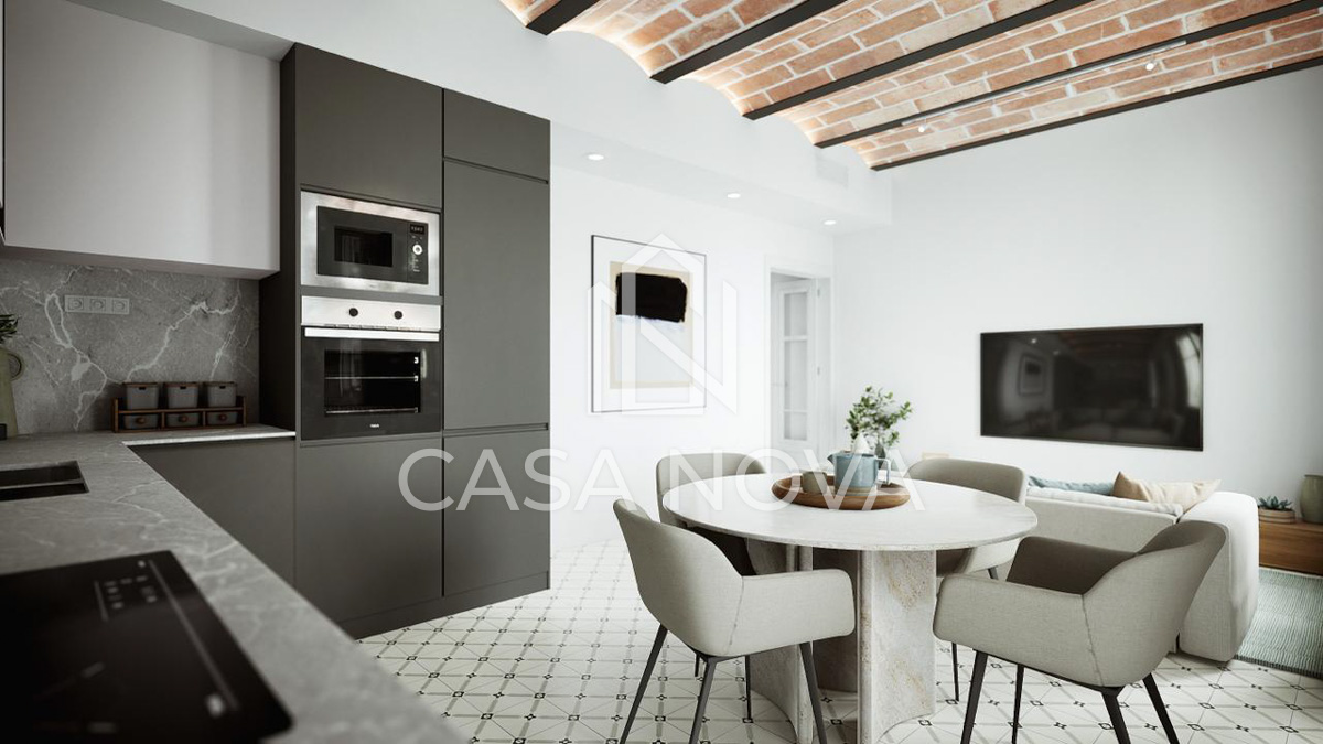 - Su acogedor comedor con cocina americana e isla central es perfecto para disfrutar en familia o con amigos. Los techos altos con volta catalana añaden un toque único y dan una sensación de amplitud.