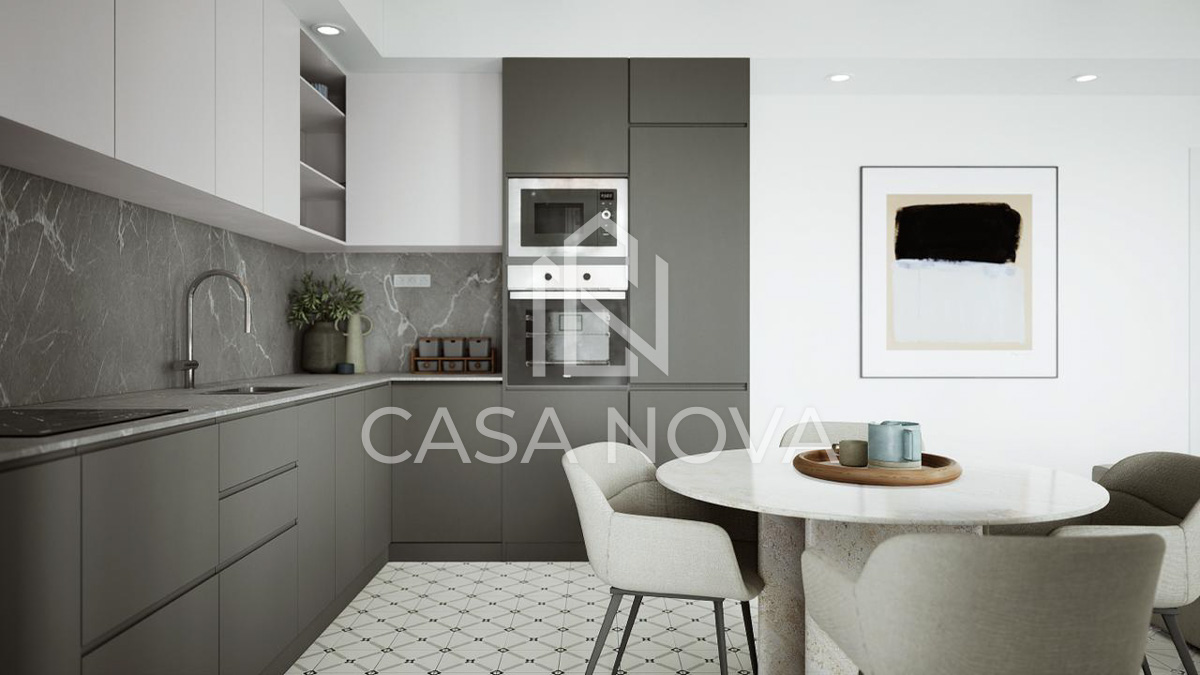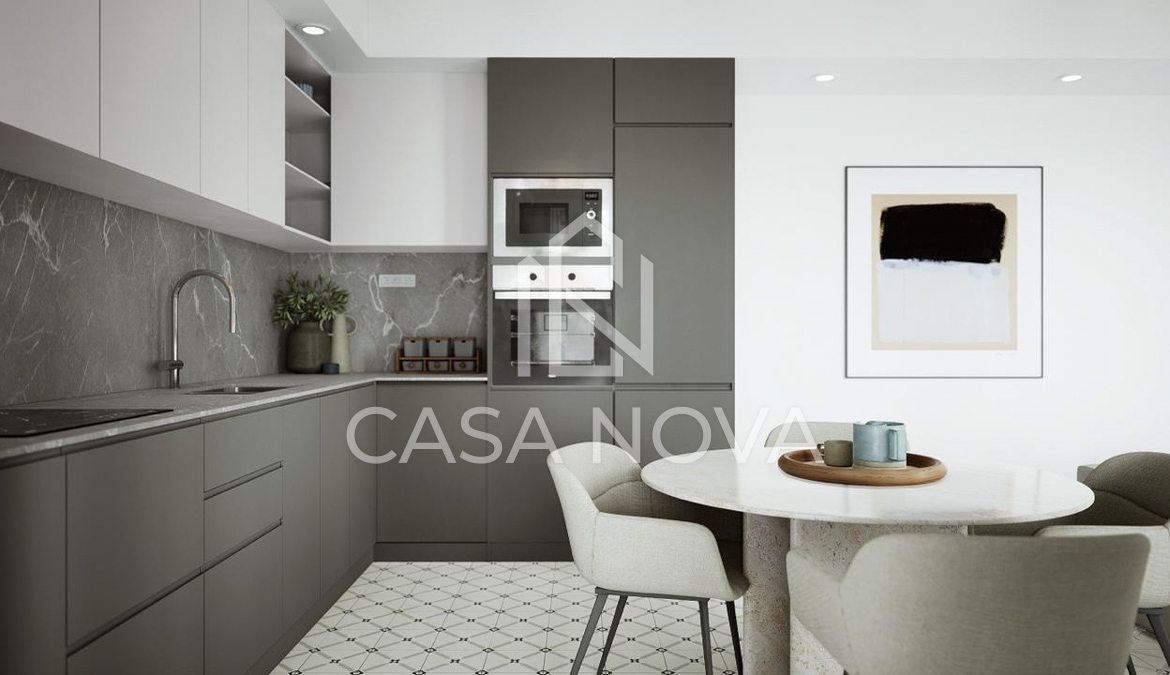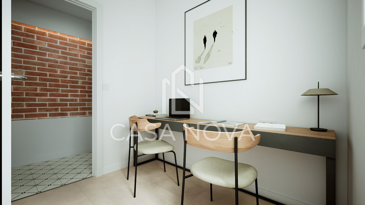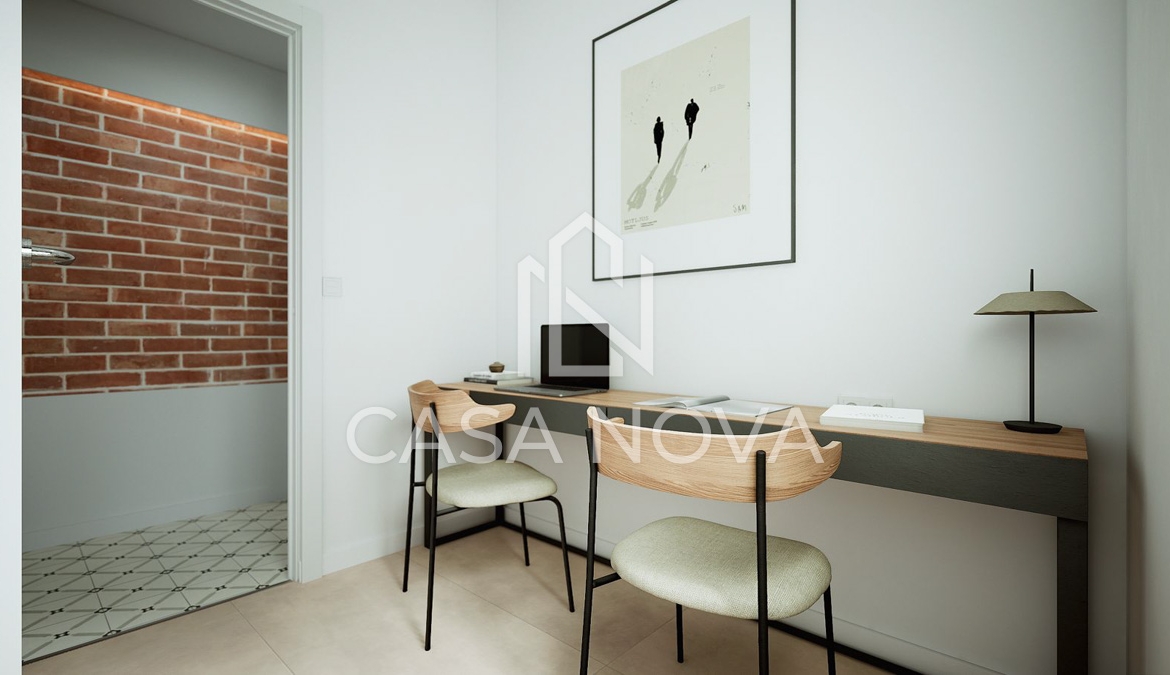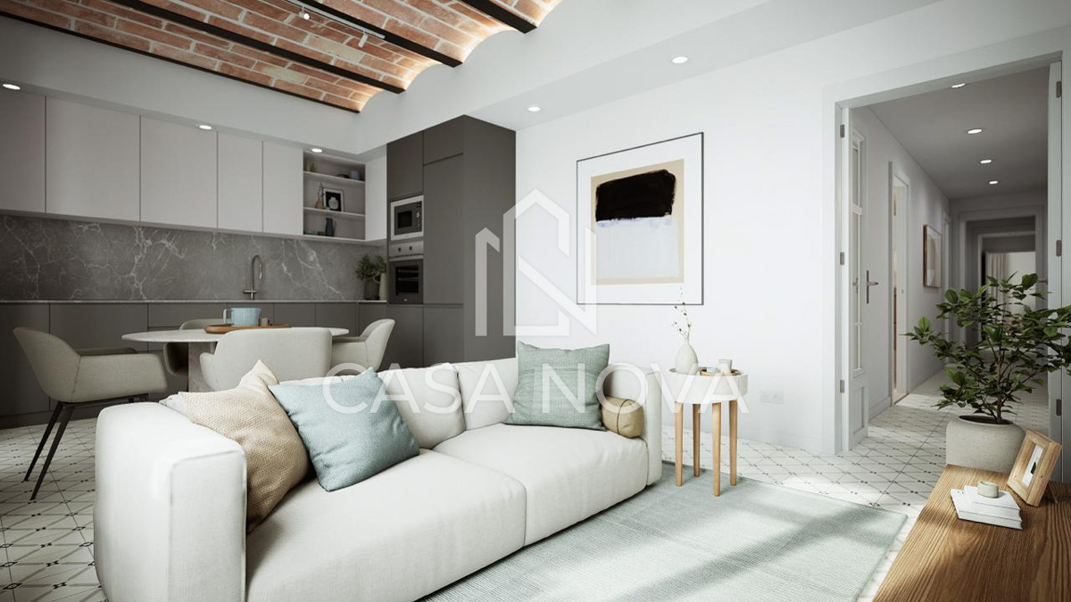 - Su acogedor comedor con cocina americana e isla central es perfecto para disfrutar en familia o con amigos. Los techos altos con volta catalana añaden un toque único y dan una sensación de amplitud.